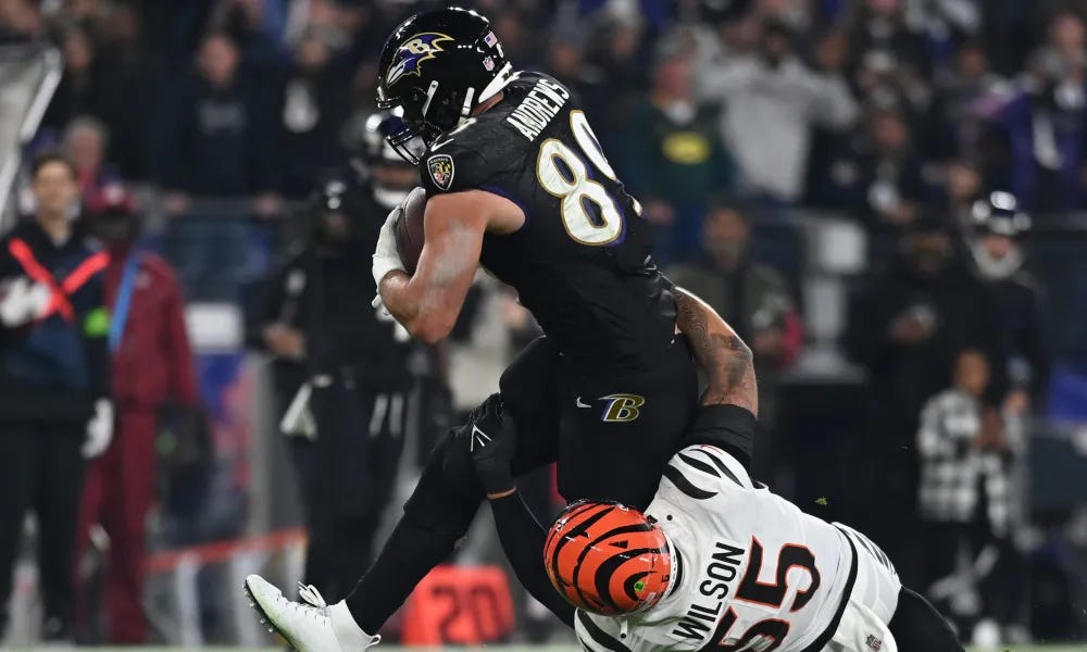 The swivel hip-drop, which we’ll henceforth call the hip-drop (although there is a slight distinction*), has caused a number of serious injuries. In 2020, a hip-drop was responsible for Dak Prescott’s season-ending compound ankle fracture. In the 2023 playoffs, a hip-drop hobbled Patrick Mahomes, while another broke Tony Pollard’s left tibia. In week 11 of the 2024 season, a swivel hip-drop from Logan Wilson broke Ravens star tight end Mark Andrews’ fibula. Andrews’ injury was the nail in the coffin for the hip-drop - the owners quickly approved a proposal from the competition committee to ban the technique, eager to save their own stars from a similar fate.