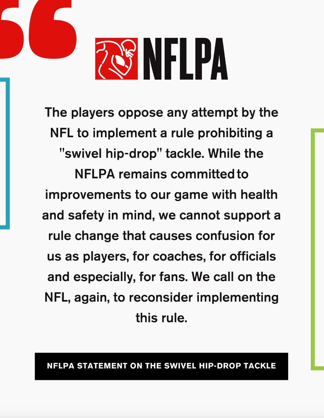 While we can write off some of the criticisms of the hip-drop ban to ex-players and traditionalist fans who have an aversion to change, or who hold a perception that the league favors offense over defense, the hip-drop ban has also faced a more surprising source of criticism: the NFL Players’ Association, who condemned the ban shortly after it was announced by the owners. If it feels strange for the players’ union to oppose a change intended to make their constituents safer, well, it is. But as we look at the likely effects of a hip-drop ban, both on and off the field, we see that what seems like irrational opposition from the NFLPA may actually be part of a larger strategy - and one that has already started to bear fruit.