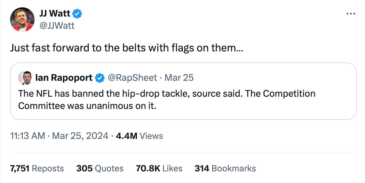 The ban brought strong criticism from some fans and ex-players. Former star defensive lineman J.J. Watt characterized the frustration by comparing the post-hip-drop NFL to flag football. Former linebacker A.J Hawk asserted that every tackle he made in his 11 seasons was a hip-drop as Pat McAfee, clad in his signature tanktop, speculated on the wider conspiracy that the ban is a ploy to increase scoring and boost TV ratings.
